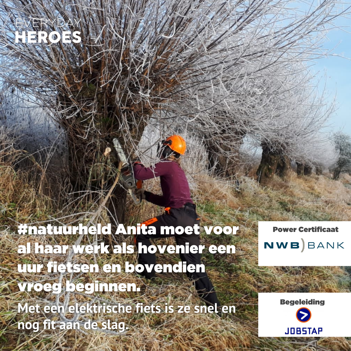 Door mijn ervaring die ik zo heb opgedaan kreeg ik vorig jaar de kans om betaald bij een hoveniersbedrijf te gaan werken voor twee dagen per week. Het is een klein bedrijf, wat goed bij me past. Het werk is leuk en afwisselend en de klik met mijn collega is erg goed. Omdat ik voor al mijn werk een uur moet fietsen en bovendien vroeg moet beginnen was ik erg blij toen mijn jobcoach me vertelde dat ik via de stichting Everyday Heroes dankzij de NWB Bank een e-bike kon krijgen. Ik had zelf een tweedehands fiets zonder versnellingen die zijn beste tijd inmiddels wel gehad heeft. Ik houd zo meer energie over voor mijn werk. Lichamelijk fit blijf ik toch wel door al het fysieke werk dat ik doe.