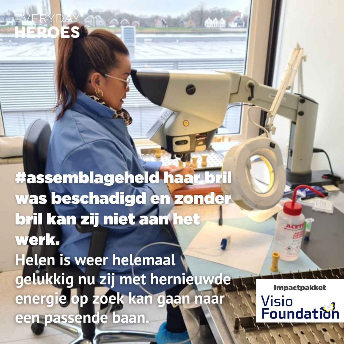 Helen is werkzaam als assemblage monteur. Haar werkzaamheden bestaan uit het assemblaren, solderen en lassen van zogenaamde flowmeters. Een baan met veel priegelwerk waar dus goede ogen vereist zijn! Door een aangeboren oogafwijking is het zicht van Helen het afgelopen jaar behoorlijk verslechterd. Een bril met speciale brillenglazen kon ze haar taken lange tijd blijven uitoefenen, maar doordat de klachten zijn toegenomen ging dat niet meer.