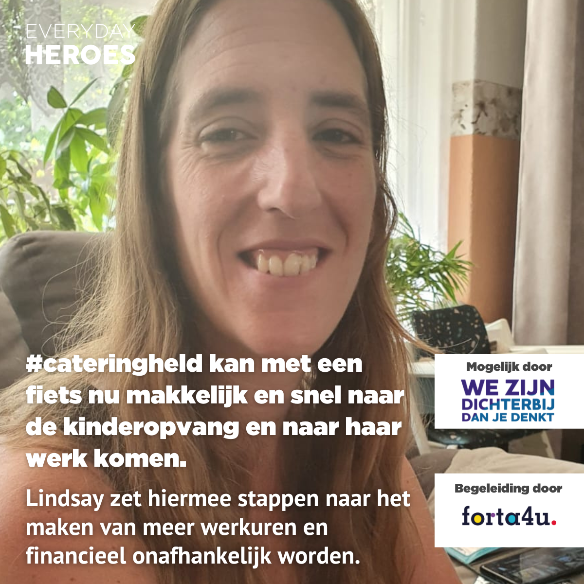 Door deze fiets van het Everyday Heroes, kan Lindsay stappen zetten in het maken van meer uren draaien (32), haar zoontje veilig naar de opvang brengen en financieel onafhankelijk worden.