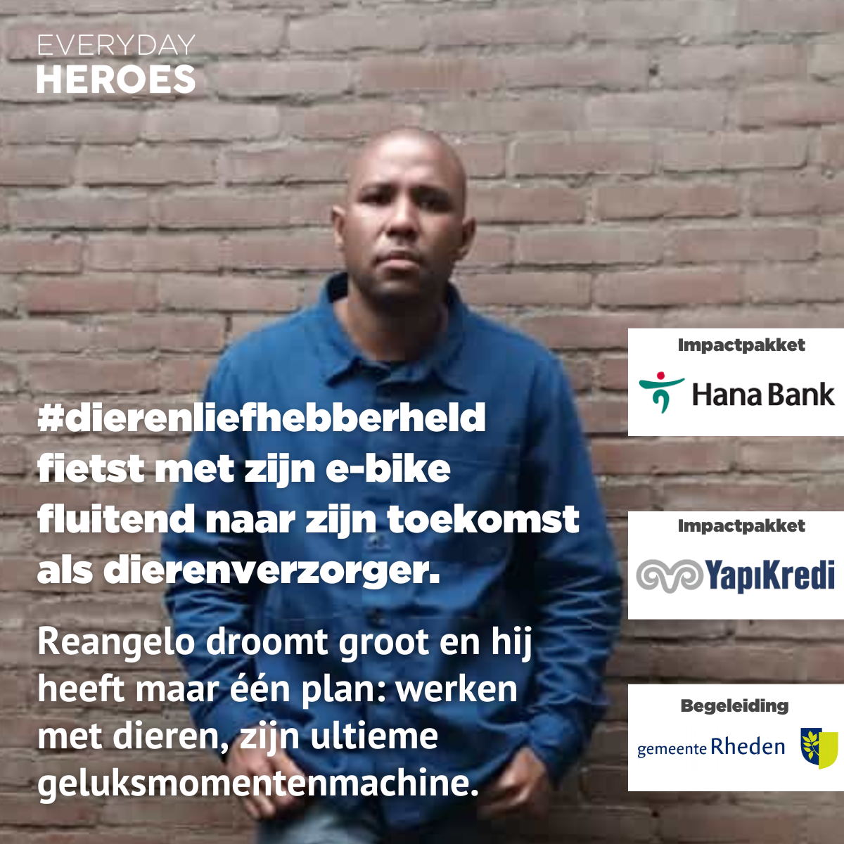 Gelukkig is dat uiteindelijk gelukt, met hulp van het werkgeversservicepunt. Er is afgesproken dat Reangelo gaat starten met een proefplaatsing van 2 maanden, om te wennen en uren op te bouwen. Hij gaat werken bij stichting Galliformes. Als alles goed gaat krijgt hij vanaf de startopleiding een contract voor minstens 21 uur per week. Het bedrijf zit in Arnhem, 35 minuten fietsen voor hem. Het geld voor een fiets heeft Reangelo niet, dus zijn we gaan onderzoeken hoe dit geregeld zou kunnen worden. Everyday Heroes heeft besloten om dit mooie succesverhaal te ondersteunen en heeft Reangelo een elektrische fiets gekregen om zijn passie te kunnen volgen!