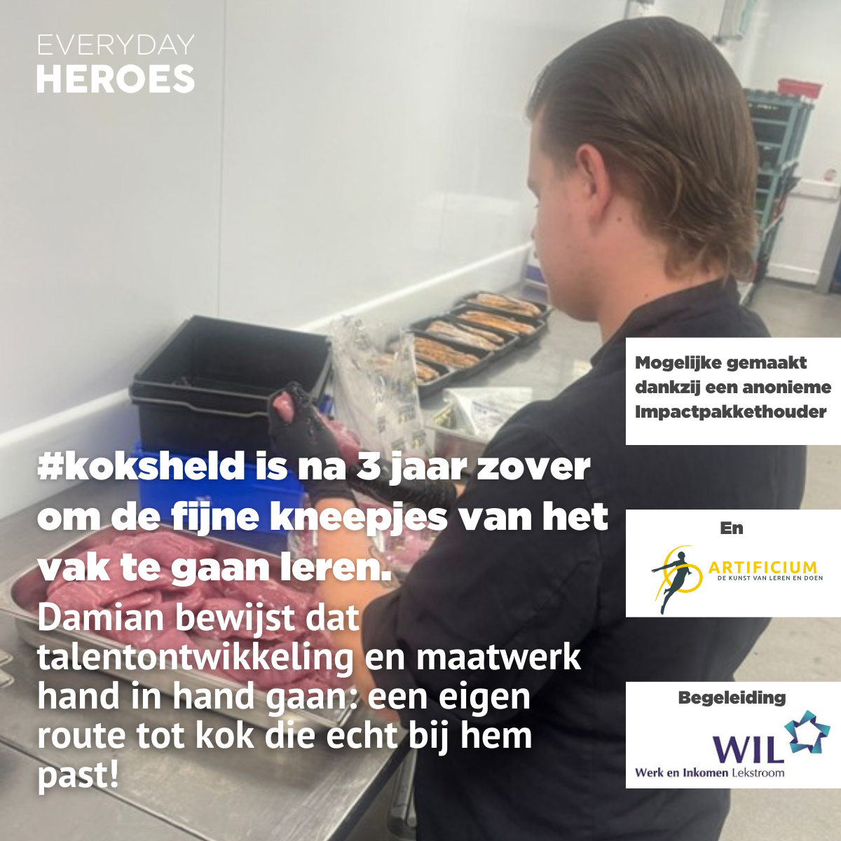Nu kan Damian een nieuwe stap zetten: hij start met de opleiding Kok niveau 2 bij ROC Midden Nederland, speciaal in de vorm van volwassenenonderwijs. Deze route is zorgvuldig uitgezocht en sluit perfect aan bij zijn mogelijkheden. Waar de reguliere opleiding een struikelblok zou vormen, biedt deze vorm hem juist de kans om te groeien en zijn talenten verder te benutten.