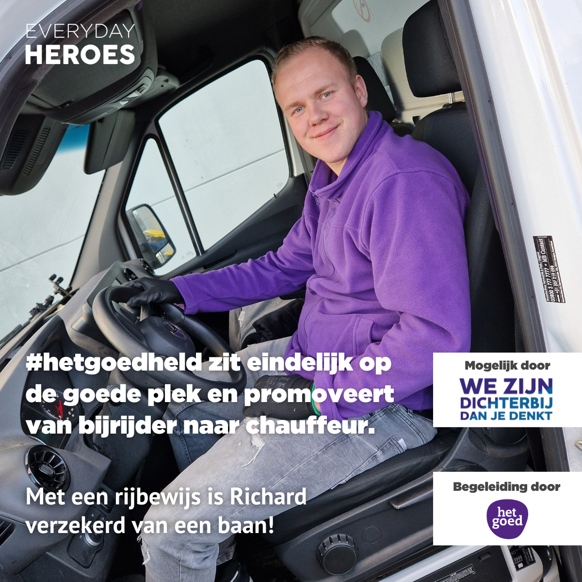 Richard is momenteel bijrijder, maar zou graag zijn rijbewijs willen halen en chauffeur willen zijn. Dit verruimt zijn werkzaamheden aanzienlijk: een baangarantie. Een aanvraag bij Everyday Heroes werd gehonoreerd en Richard is vol enthousiasme aan de slag met het halen van zijn rijbewijs.