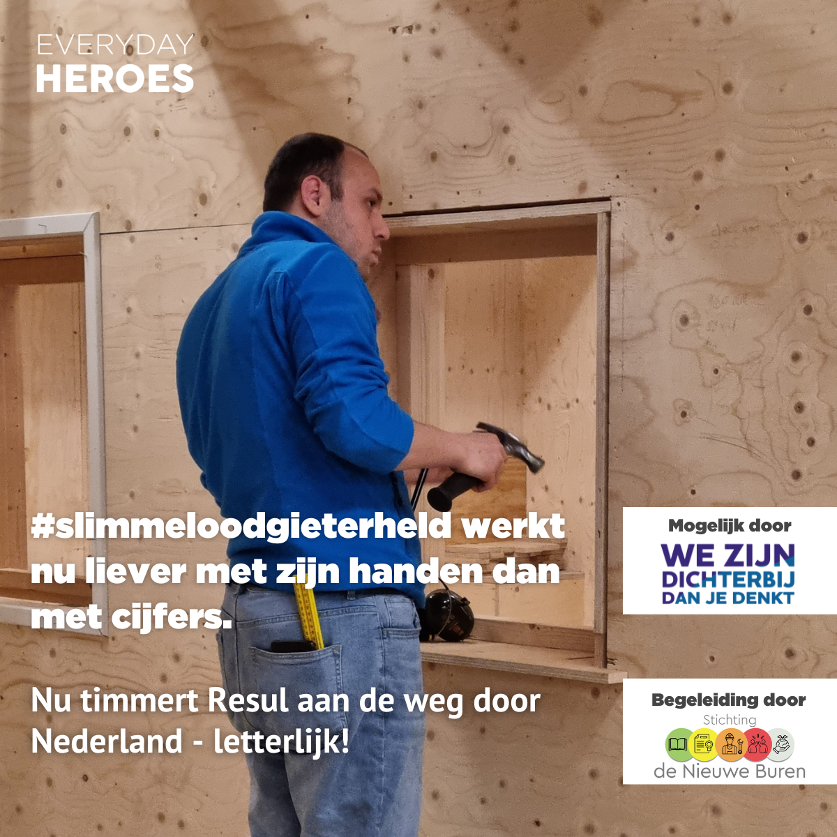 Resul is een 29 jarige man die graag in de bouw wil werken en zich verder wil ontwikkelen. In Turkije heeft hij als administrateur gewerkt maar hij volgt nu met veel belangstelling een opleiding tot timmerman om in de bouw te gaan werken. Hij vind het heel fijn om met zijn handen te werken.