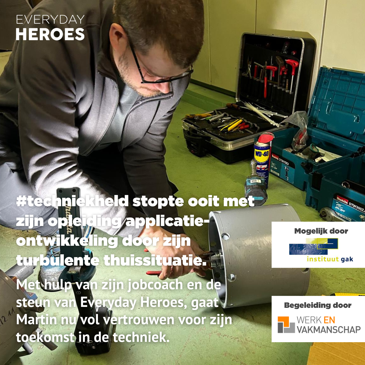 Omdat de functie in kwestie een buitendienst functie betreft is het voor Martin noodzakelijk om op korte termijn een rijbewijs te behalen zodat hij zijn baan kan behouden. Dit is het laatste obstakel dat een rooskleurige toekomst in de weg staat. Martin heeft dankzij zijn periode in de uitkering financiële achterstand opgebouwd en is momenteel niet zelf in staat om binnen een redelijke termijn zelfstandig zijn rijbewijs te financieren. Samen met Everyday Heroes heeft Martin dit laatste obstakel weten aan te pakken zodat hij zijn pijlen kan richten op het bouwen van een prachtige carrière in de techniek.