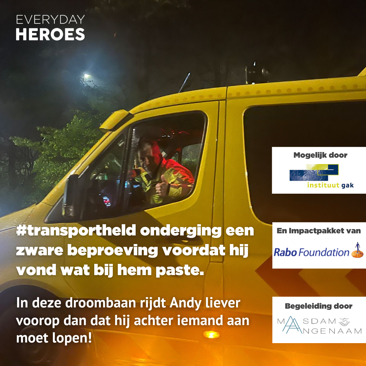 Zijn zeer toegewijde coach Ben kreeg de opdracht om met hem te zoeken naar werk dat beter bij hem paste. En dat bleek een uitdaging, want Andy is niet het type voor een kantoorbaan of theoretische opleiding. Toch kwam er, mede door zijn eigen inzet, iets moois op zijn pad. Via een oude kennis uit de buurt — iemand met een bedrijf in transportbegeleiding — mocht Andy een paar keer meedraaien. Vooral ’s nachts, in binnen- en buitenland.