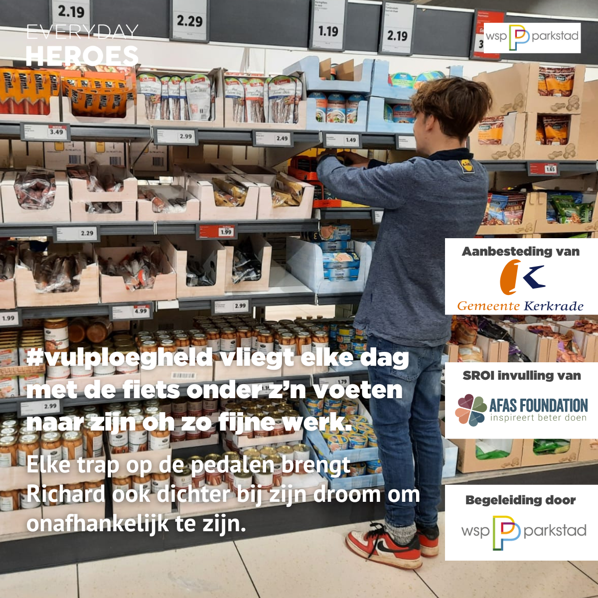Richard is 17 jaar en werkt op dit moment bij de Lidl in Kerkrade. Voor Richard was het leven niet altijd even makkelijk. Hij vond leren niet zo leuk en werkt liever. Ook is hij graag met zijn handen bezig. Door te werken wil hij graag sparen voor zijn toekomst, zodat hij dingen kan ondernemen en uiteindelijk ook financieel voor zichzelf kan zorgen.